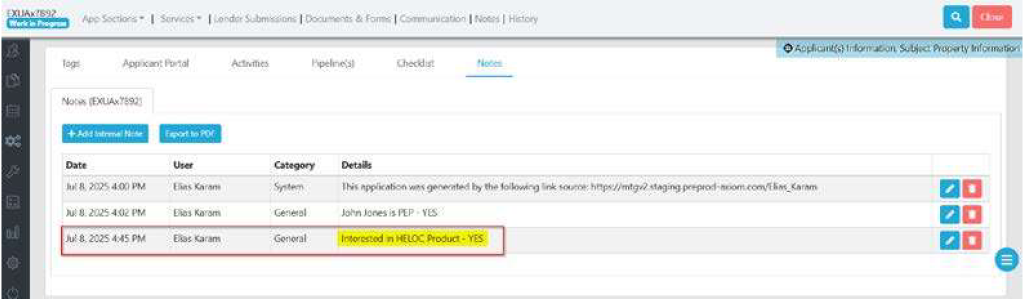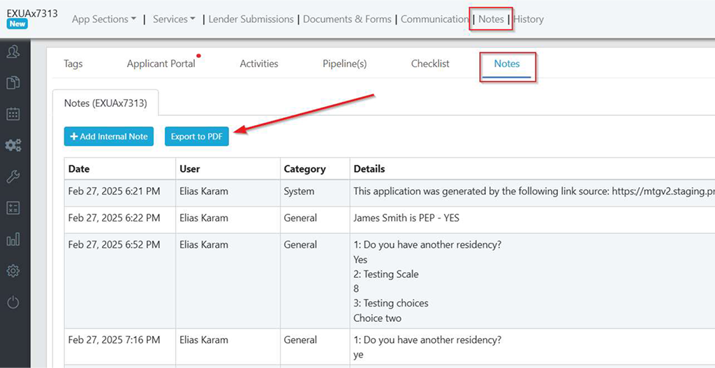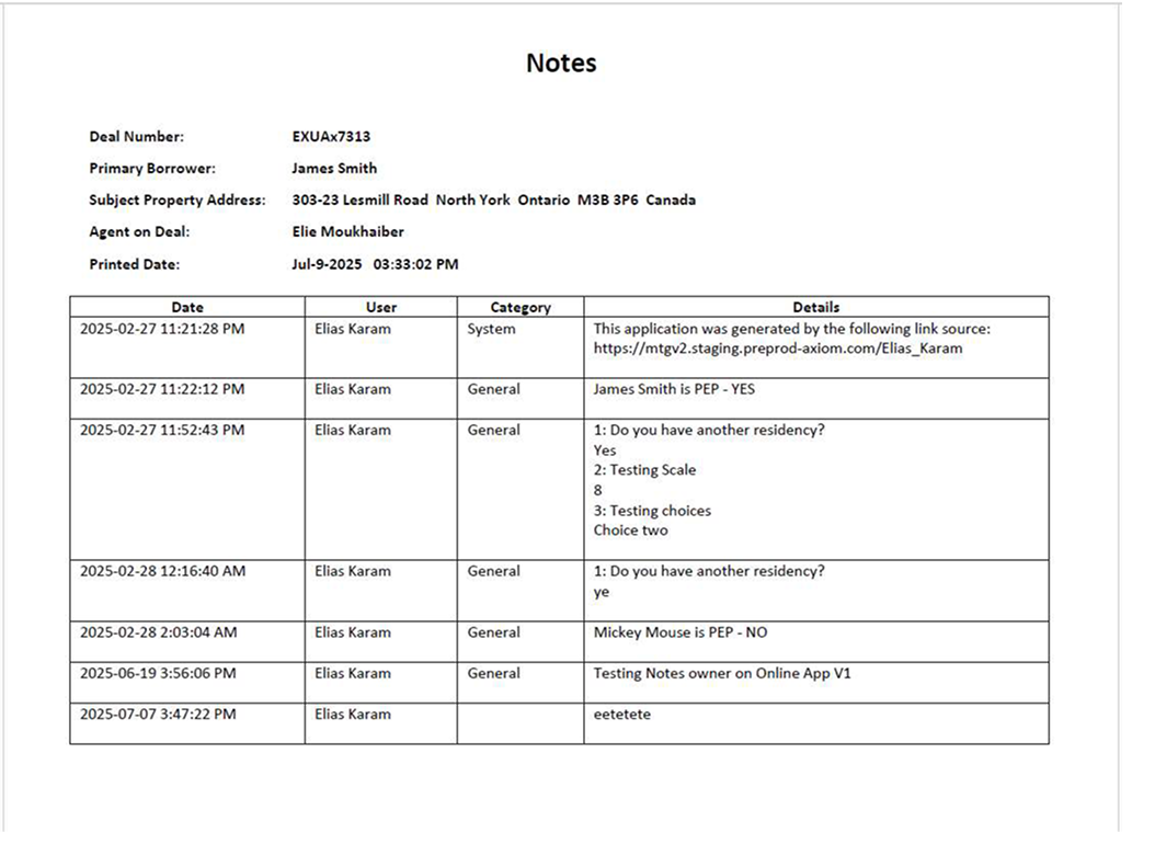 • When selected, the system will generate a PDF containing all internal notes logged on the deal.