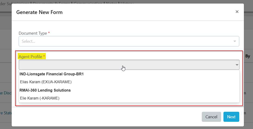 This update adds a new dropdown that allows agents with multiple profiles to select the appropriate Agent Profile when generating forms – ensuring the correct profile details are automatically filled in.