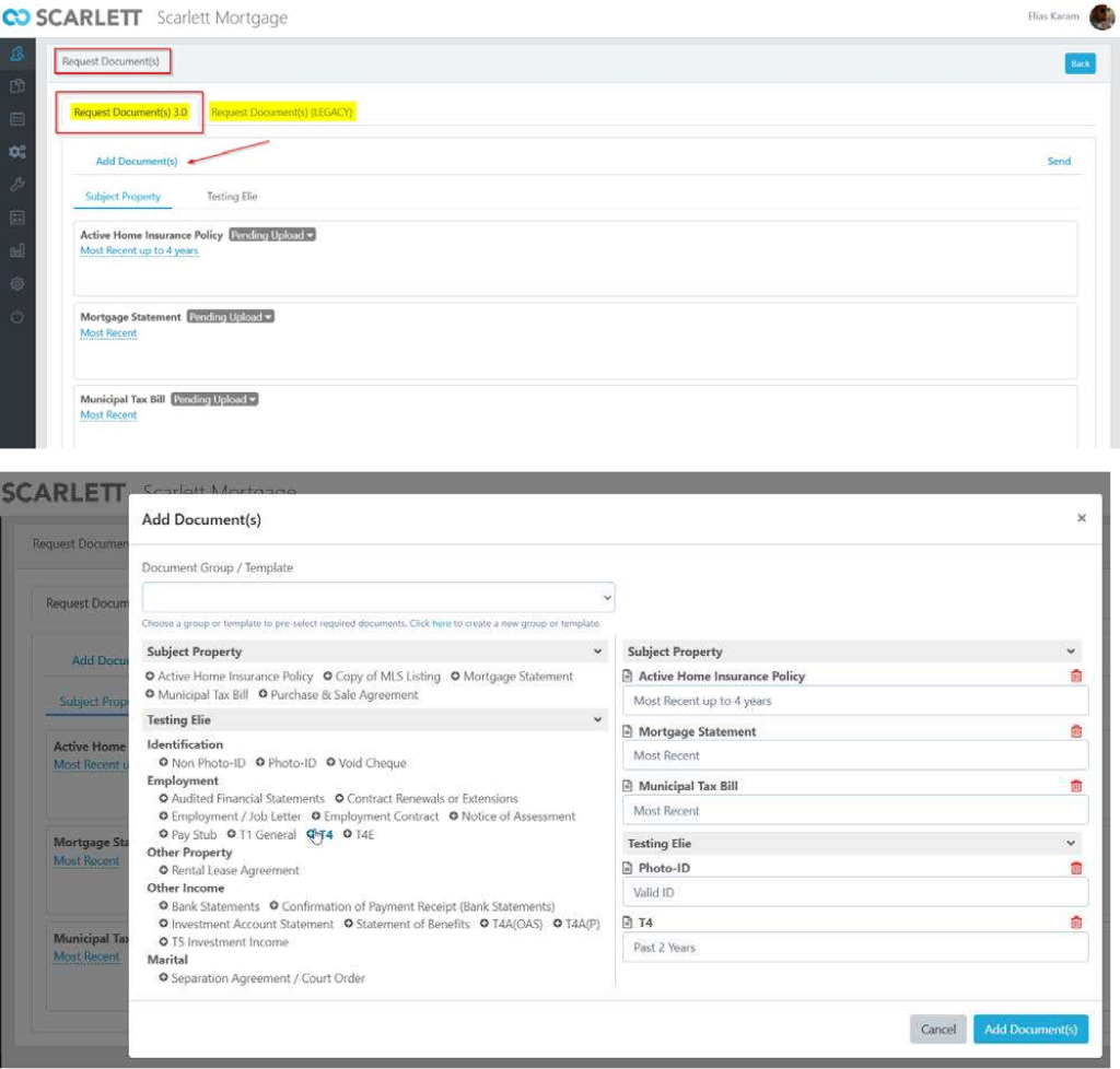 Select ‘Request Document (s) 3.0’ tab → click on ‘Add Document(s)’ will open the list of documents (mirrors the layout, behaviour and flexibility of document request within Apps & Deals)