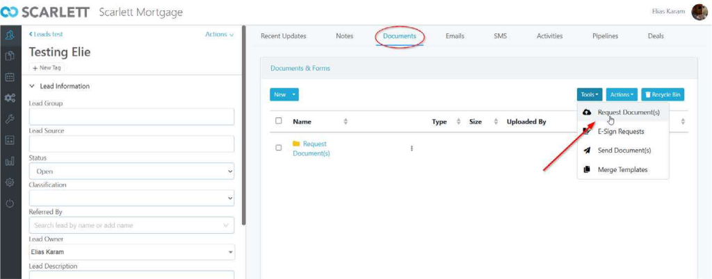 Under any Lead → Documents tab, agents can now access: Tools → Request Document(s)