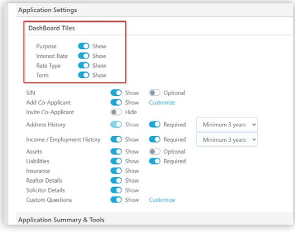 Agents now have more control over what their clients see in the App 3.0 dashboard. A new Dashboard Tiles section has been added under App Settings 3.0 → Application Settings, allowing agents to choose which key details are visible on the client-facing tile.